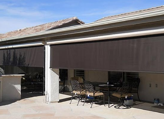 เฉดสีโรลเลอร์กลางแจ้งกว้าง 12 ฟุตหรือที่รู้จักกันในชื่อ 144 ' เฉดสีม้วน ด้านนอก กว้าง หน้าต่างเหล่านี้ใช้สำหรับกลางแจ้งการป้องกันแสงแดดความเป็นส่วนตัวและอุณหภูมิสามารถควบคุมได้อย่างดีในทุกเฉดสีกลางแจ้งที่ไร้สาย